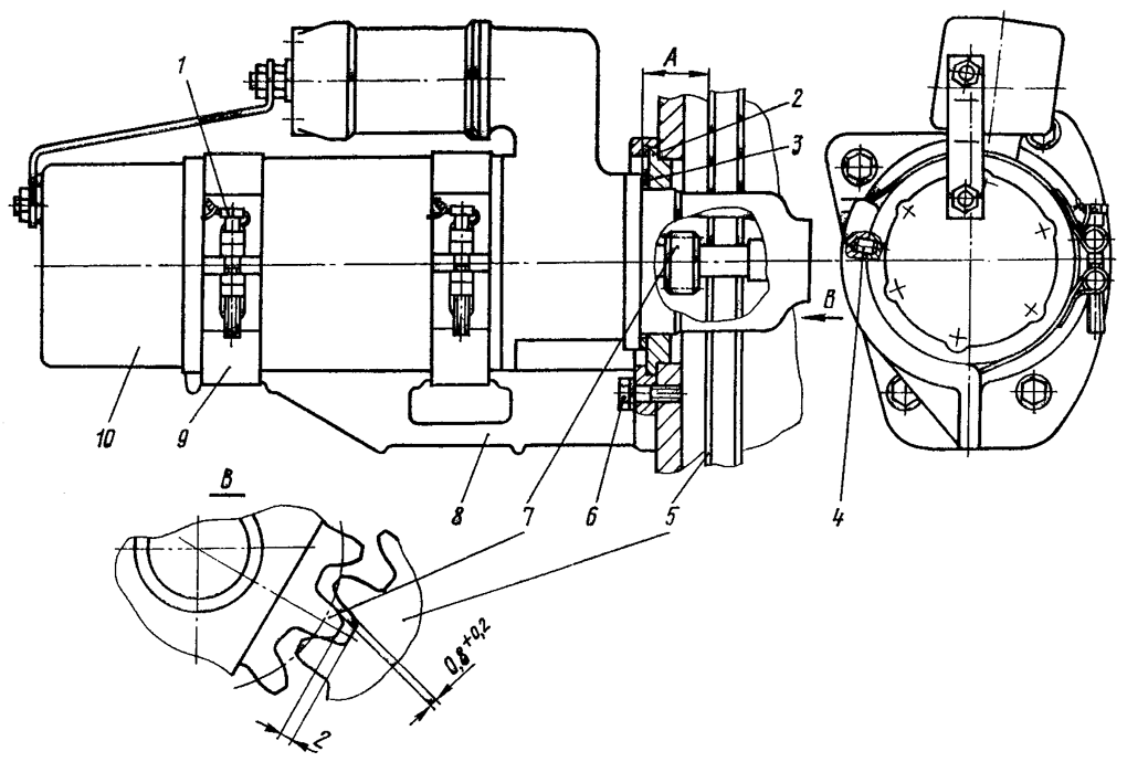 Этот размер установите, изменяя количество регулировочных колец, одеваемых на шейку стартера. Боковой зазор между зубьями шестерен 7 стартера и венцом 5 маховика должен быть в пределах 0,8 ... 1 мм, а радиальный зазор — не менее 2 мм.