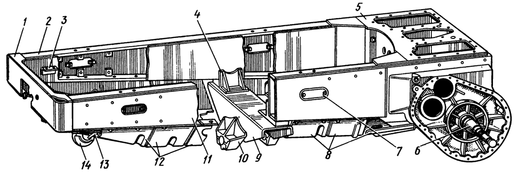 Благодаря шарнирному соединению балансирного устройства с рамой трактора обеспечивается независимое перемещение тележек гусениц относительно полуосей бортовых редукторов.