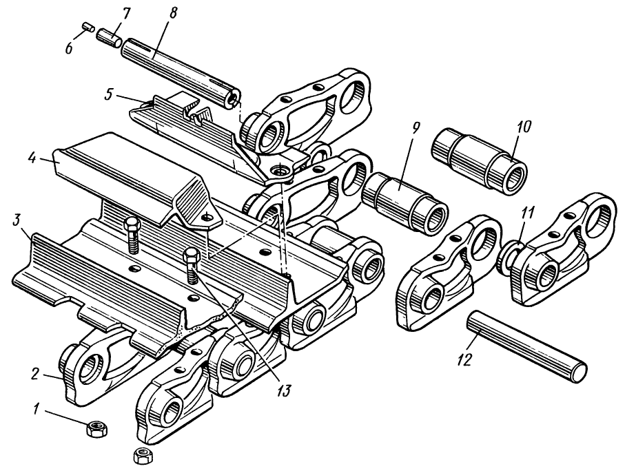 К звеньям гусеничной цепи болтами 13 и гайками 1 прикреплены башмаки шириной 500 мм с почвозацепами.