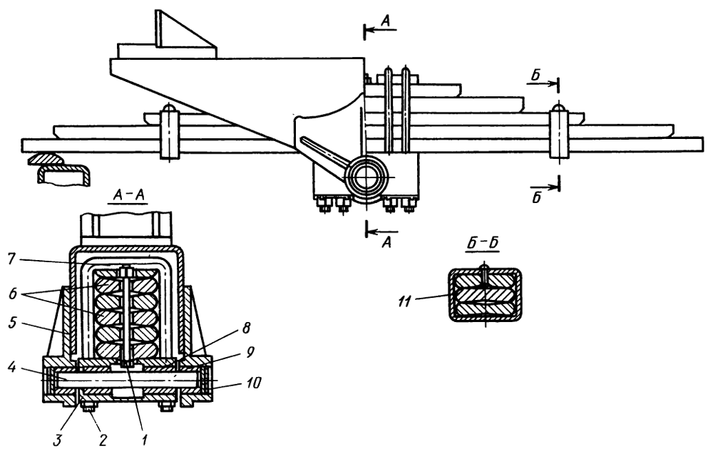 Балансирная рессора состоит из пяти листов 6, стянутых четырьмя стремянками 7. Для удобства монтажа листы скреплены между собой центральным стяжным болтом 1 с гайкой, а три нижних листа — дополнительно и стяжками 11.